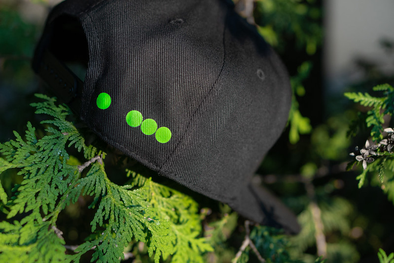 Protects you from sunlight, strong winds and stupidity. Adjustable for every shape and size head. Logo in front, 4 dots on the back.